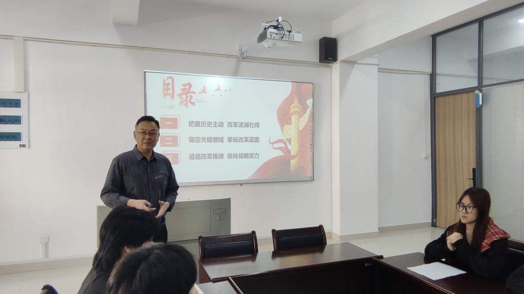 讲授过程中,彭忠伟主任带领学生党员回顾了党的十八大以来的改革推进进程。他表示,党的二十届三中全会站在新的历史起点上,科学谋划进一步全面深化改革,使中国改革开放矗立起新的里程碑。彭主任又为学生党员系统阐述了全会精神中进一步全面深化改革的指导思想、总目标、重大原则和重大举措,引导学生全方位分重点有层次把握全会精神的主旨要义。同时,他从政治、经济、民主、法治、文化、民生、生态文明、国家安全等多方面,阐明了新时代的改革是科学的、开创性的、一以贯之的,富有成效的。此外,他特别强调了“六个坚持”的重要性与中国改革开放必然胜利的根本事实,要求学生积极培养创新思维,做到爱党爱国爱校,努力成长为可担大任的时代新人,为推动实现中华民族伟大复兴的中国梦一往无前,不懈奋斗。