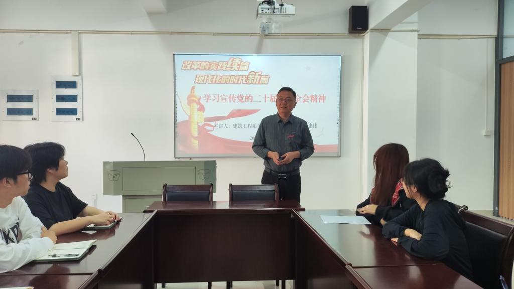 本网讯/为进一步学习宣传党的二十届三中全会精神,2024年11月11日下午,建筑工程系主任、系党总支副书记彭忠伟在建工楼502会议室开设学习宣传党的二十届三中全会精神专题讲座,全系在校学生党员到场聆听。
