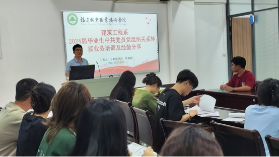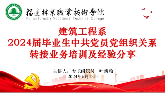 本网讯/为进一步加强毕业生党员党组织组织关系规范化管理,确保2024届毕业生党员在升学、就业、返乡等过程中能够顺利转接党组织关系,2024年5月13日下午,建筑工程系专职组织员叶新颖老师针对2024届毕业生党员就“中共党员党组织关系转接业务培训及经验分享”开展了讲解和培训教育。