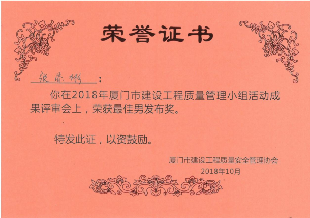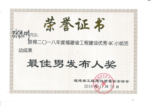 在QC(质量管理)方面:参与的《埭头溪截流河道桥钻孔灌注桩施工工法》、《高原严寒地区冬季混凝土施工工法》、《小段面长距离施工工法》、《地下工程注浆封水高新技术》、《受限空间软弱地基新型围护结构研发》、《东莞市沙田镇立沙岛管廊项目QC小组》等课题,先后获得厦门市、福建省、全国建筑、市政、水利优秀质量管理小组成果一等奖。在个人发布环节中获得:厦门市、福建省、全国QC最佳发布人。实现了QC质量管理小组,课题与个人的全满贯荣誉。