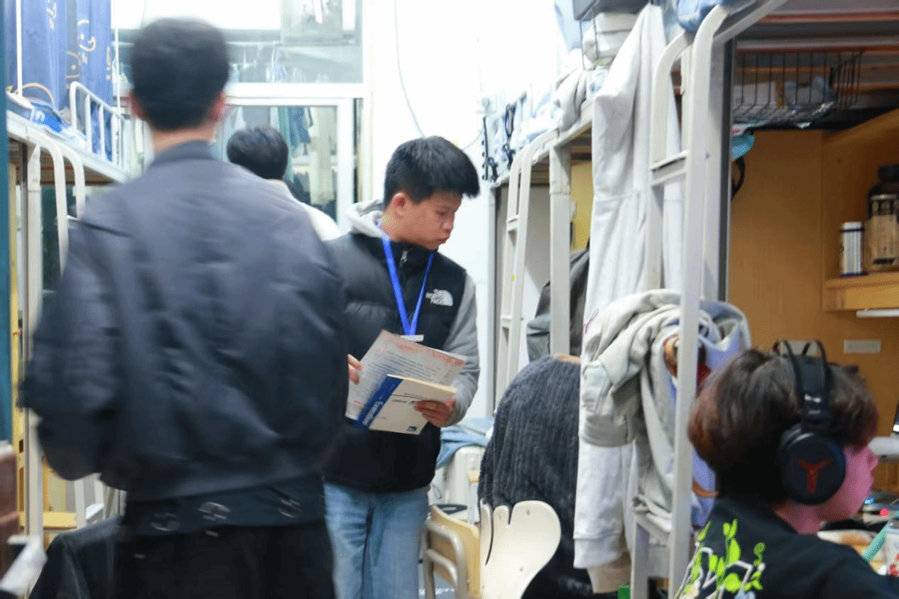 检查过程中,工作人员们认真细致地查看每一个角落。保卫部仔细检查宿舍的电路设施,确保电线无破损、插座无松动,杜绝用电隐患;纪检部给每个宿舍分发国家安全宣传单,并组织同学们微信关注国家安全部官方微信公众号和国家安全部官方微信视频号。
