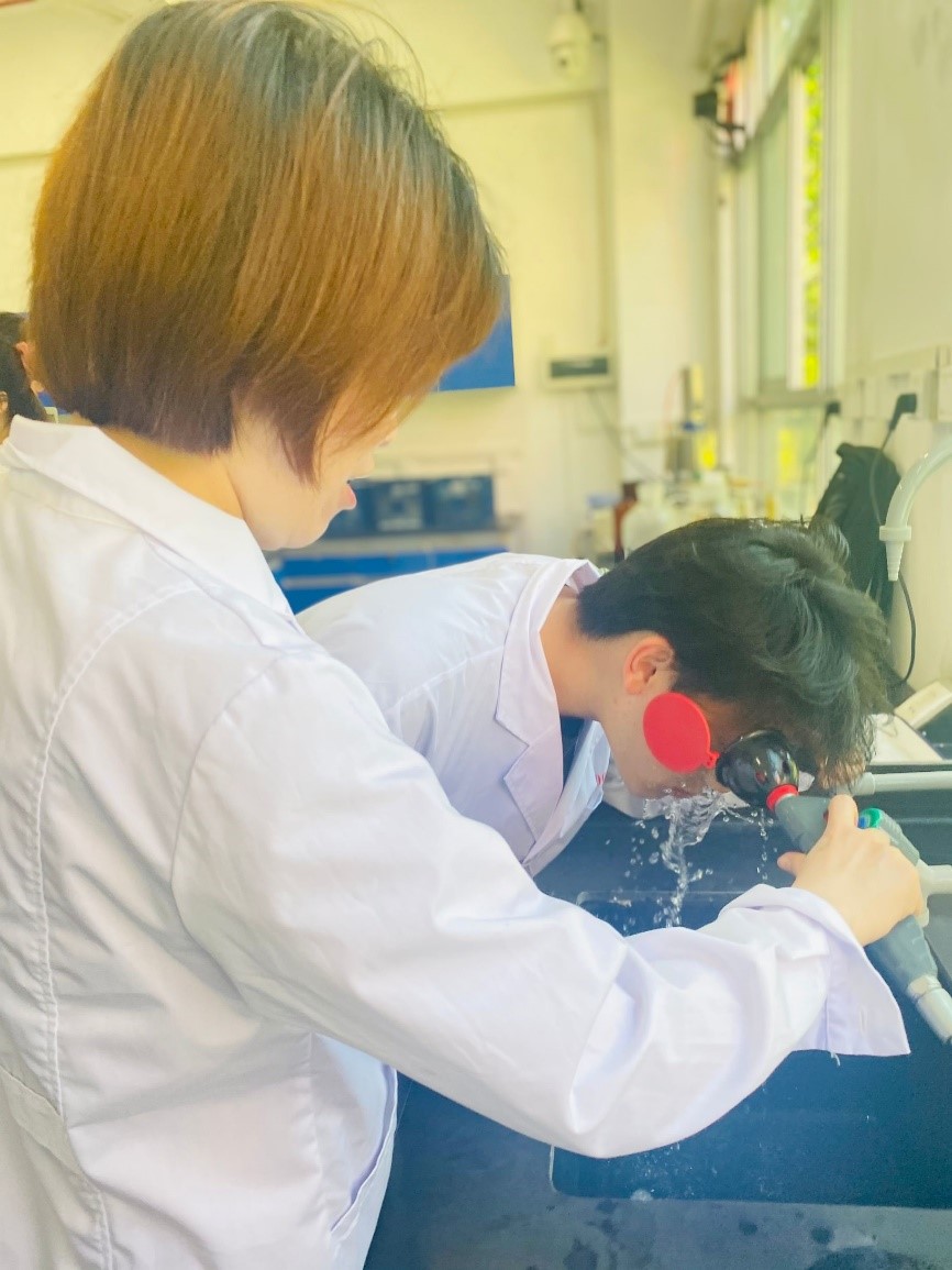 在化学溶液溅到眼睛应急演练中,模拟同学在溶液配制中,被低溶度化学药剂溅到眼睛,指导老师第一时间引导学生用洗眼器冲洗眼睛,尽可能减少化学溶剂对眼睛的伤害。实验员老师迅速联系学校医院医生,学院医生立即带上相关药品并于5分钟内赶到现场并进行检查治疗。