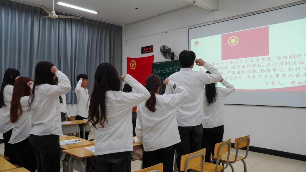 全体成员肃立,齐声高唱团歌《光荣啊,中国共青团》。一朝入团,一心向党。在激昂澎湃的旋律中,团员们目光坚定,昂首挺胸,用洪亮的歌声表达对祖国的热爱和对共青团事业的忠诚。随着这首歌曲的结束,标志着组织生活会正式拉开序幕。