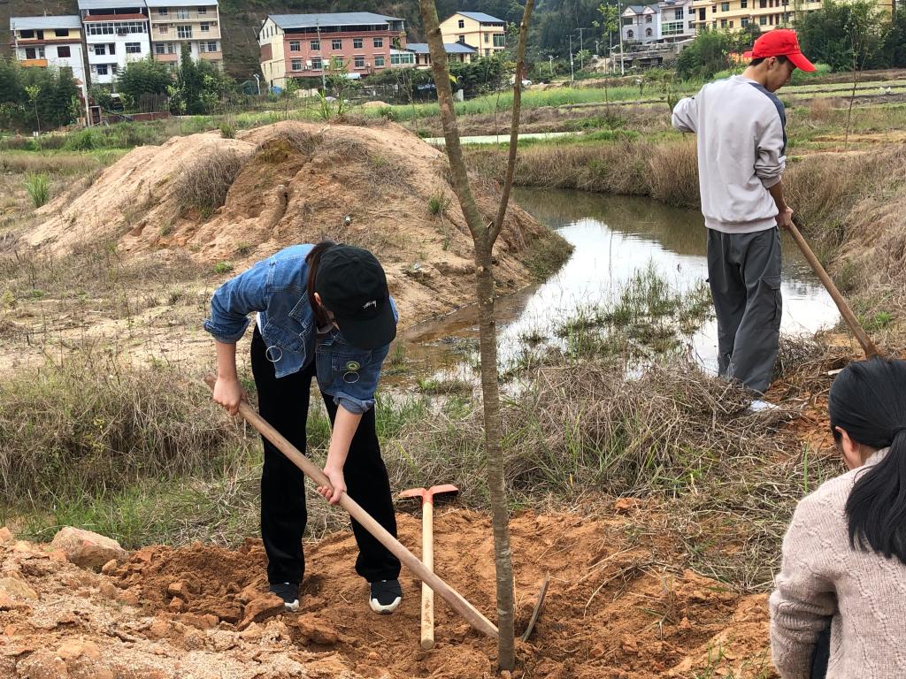 我系支部全体成员积极行动,将一颗颗树苗植入土里,干劲十足,激动人心。我系台湾老师巫智斌为洋坑村分析土壤土质,给出适合种植品种的指导性意见,还十分专业地讲解了樱花树的种植注意事项。