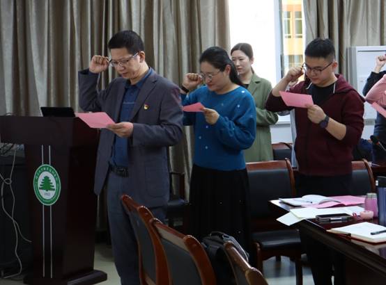 叶世森副院长带领新教师庄严宣誓:“忠诚党的教育事业,贯彻国家教育方针,履行教师神圣职责。修身立德,为人师表;终生学习,严谨治学;关爱学生,教书育人;传承文明,勇于创新;爱国守法,爱岗敬业;廉洁从教,乐于奉献。为全体学生美好未来,我愿奉献全部智慧和力量!”