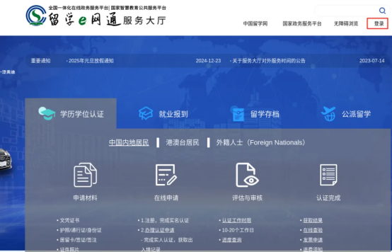 三、办理事项:点击留学e网通服务大厅,认真阅读填报须知后点击“确定”,点击右上角的登录按钮,未注册的用户先选择注册再登录,已有账号的用户通过输入账号密码进行登录。