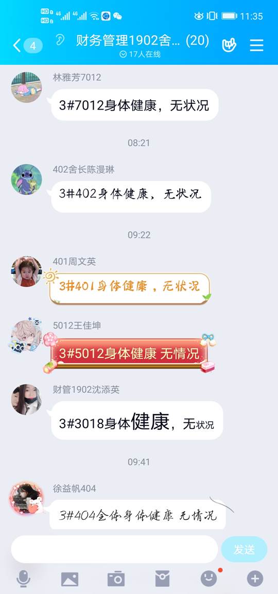 经管系学生科长、辅导员王昉:班委群设置每天闹钟,每个班委负责5-10个学生定点催;每天早上班级防疫信息员对填报数据进行筛查,对没完成的数据、填报格式有误的数据、有疫情的数据等进行第一关口核实、催促;辅导员再第二次核查、督促钉子户和困难户。