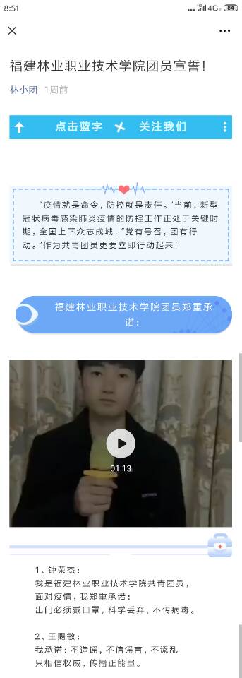 通过网站、微信公众号、微信群和QQ群等平台,转发学院《致全院学生的一封信》、《我是林职人,我承诺》、《防护指南》等,大力宣传新型冠状病毒的相关防护知识、防控要点、注意事项、救治措施。