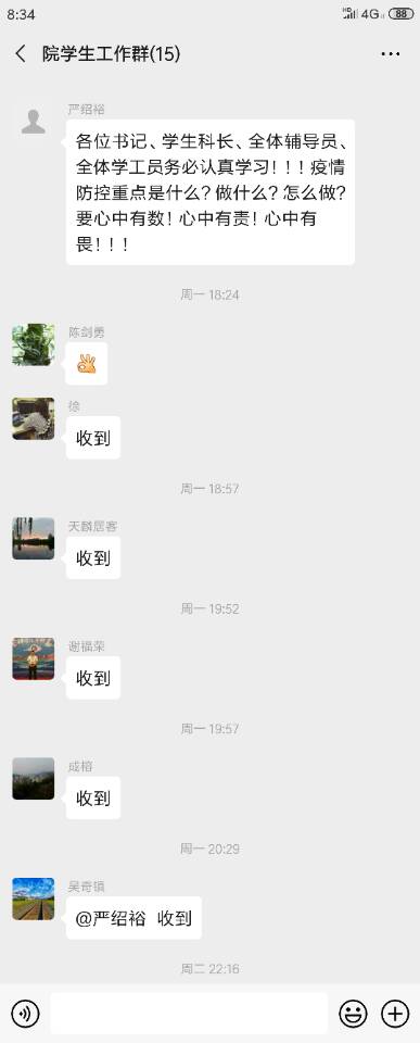 学院党委副书记严绍裕:疫情面前无小事,作为一名学工干部,一名党员,我们要响应党的号召,服从学院的安排,本着高度负责的态度做好每一件事,为阻击疫情,为履行肩负的职责和担当,我们心中有爱,我们无惧无畏。雾霾总有散的时候,疫情总有战胜的时候,众志成城,没有我们过不去的坎儿。