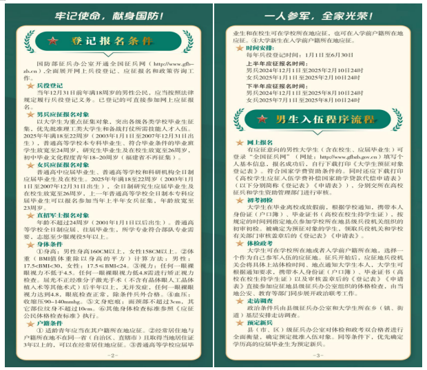 据悉,学院在征兵季期间将持续加大征兵宣传力度,提升服务保障质量,通过征兵宣传海报、征兵宣传咨询群、辅导员群、班级群、校园LED屏滚动播放征兵宣传视频等方式持续推送征兵宣传信息,引导广大适龄青年学生树立正确的国防观念,依法服兵役观念,积极营造携笔从戎,投身军营的浓厚氛围。