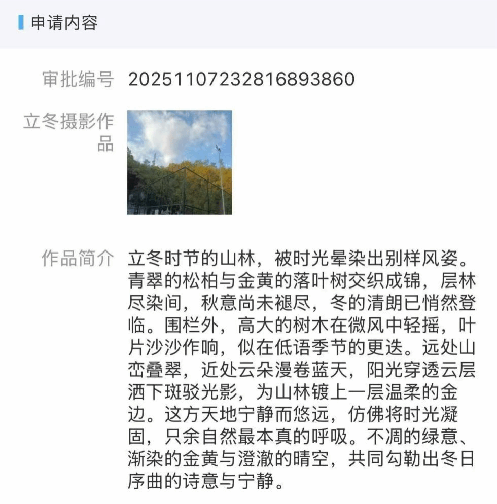 当朔风渐起凝霜华,木叶翻黄报冬来,立冬作为冬季的首个节气,为天地间铺就了独特的诗意画卷。为丰富校园文化生活,搭建摄影爱好者交流展示平台,引导学子发现生活之美、热爱校园时光,学生工作部于2025年11月4日至12月4日开启“立冬即景·用快门收藏冬日开端”摄影征集活动,面向全院学生发出创作邀约。全院328位学生积极参与,在易班APP上踊跃打卡