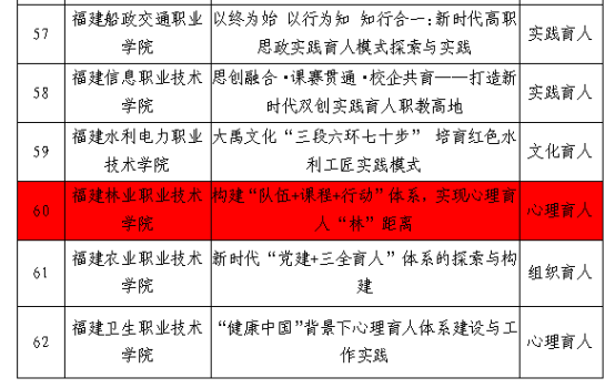 近日,中共福建省委教育工委公布的2022年福建省高校思想政治工作精品项目、高校原创文化精品项目、高校思想政治工作中青年骨干和高校网络教育名师入选名单中显示,我院心理育人项目《构建“队伍+课程+行动”体系,实现心理育人“林”距离》入选。