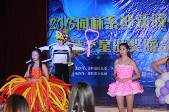 7点30分整,晚会在动感十足的爵士舞中拉开了序幕。银色灯光下这群舞者活力四射的表演,为晚会的成功举办营造了热烈的气势。晚会节目十分丰富,歌曲、小品、魔术气球秀、民族舞蹈、古筝弹唱、话剧等一一呈现在观众眼前。三位即将参加顶岗实习的毕业生呈上的《致光阴》串烧歌曲带领我们回想过去的美好时光,光阴似箭,时光如梭;民族舞蹈《佤族甩发舞》配合精彩的多媒体展示,让大家领略到中华灿烂的民族文化;精彩的《魔术气球秀,I SO YOU》更是让现场的气势达到了高潮。整场晚会穿插进行着“园林之星”的颁奖环节,包括技能之星、学习之星、创业之星、体育之星、文艺之星、服务之星、自强之星、道德之星等共14名同学获得此殊荣。这是园林系学工组举办的首届“园林之星”评选活动,通过学生自愿申报、班级推荐、组织评审等环节层层推荐、选拔出来的,充分展示了园林系学生积极进取、拼博奋进的正能量。院党委副书记陈洪尧老师、园林系主任黄勤坚老师、图书馆副馆长黄华明老师和园林系党总支副书记陈剑勇老师为获奖者颁奖。
