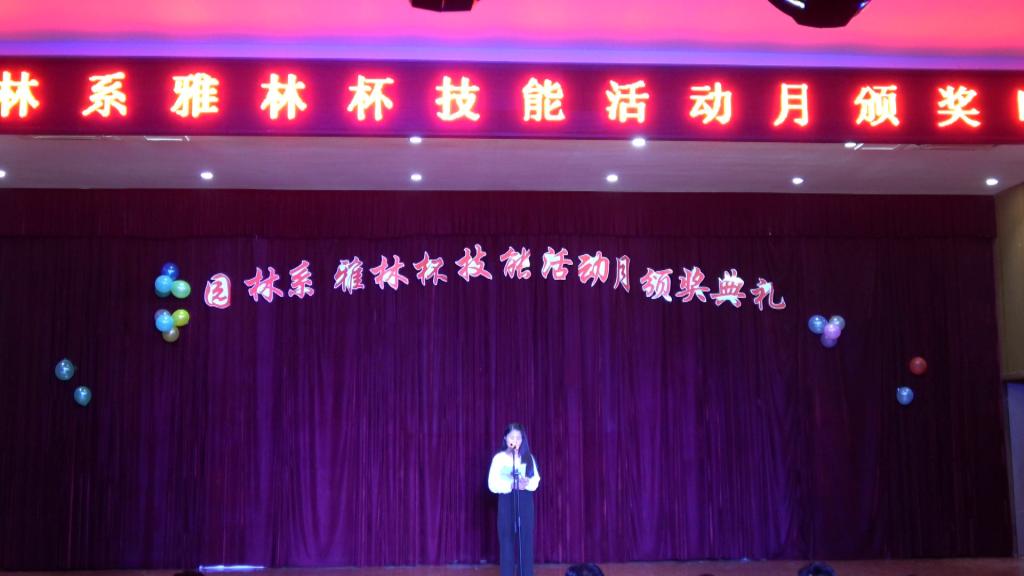 为践行“工匠精神”,弘扬“天麟精神”,2018年10月11日晚上7点,园林系于江南校区礼堂举办“雅林杯”技能活动月颁奖晚会。参加晚会的有学院党委副书记陈洪尧、园林系党总支副书记陈剑勇、园林系吴锦鸿老师和孙钰老师以及园林系全体大一新生。