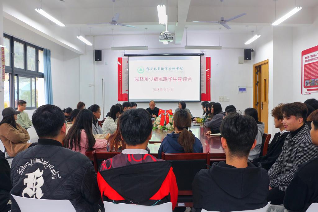 为铸牢中华民族共同体意识,全面了解少数民族学生日常的思想、学习和生活状况,增强他们的归属感和获得感。2024年3月22日下午,园林系在园林楼408会议室召开新学期少数民族学生座谈会。园林系党总支书记陈剑勇,党总支副书记黄淑燕、学生科科长兼团总支书记吴锦鸿,以及辅导员刘延君、连静、林晓芳和少数民族学生代表出席本次座谈会。