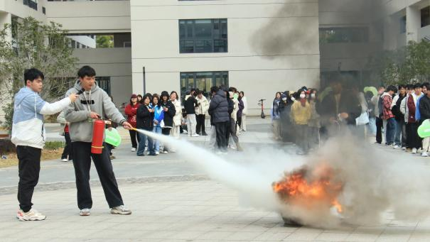 随着一阵急促的疏散哨声响起,模拟火场逃生环节正式拉开序幕。同学们迅速响应,严格按照指导要求,弯腰低姿、捂住口鼻,沿着预先规划好的疏散路线,井然有序地撤离至园林楼前的安全区域。抵达园林楼后,学院安全保卫处宣讲团成员缪永吉通过细致入微地讲解和标准规范的分解动作示范,让同学们对灭火器的操作步骤有了清晰直观地认识。为了加深同学们的理解和记忆,还特别邀请了部分学生亲自上手操作,亲身体验灭火过程。同学们踊跃参与,在实践中进一步巩固了所学的消防知识,真正将消防安全的“种子”深植于心间。