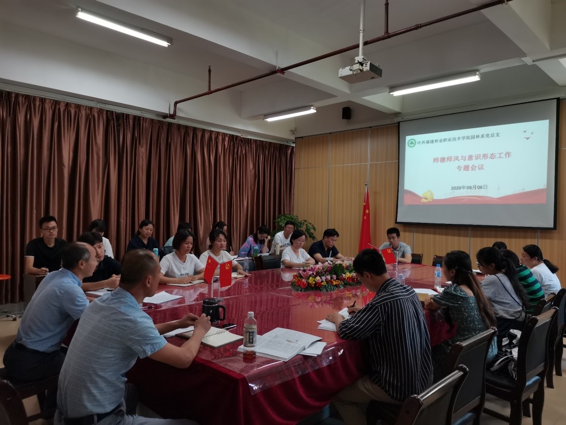 9月6日下午,园林系党总支在系会议室召开师德师风与意识形态工作专题会议。系党总支书记陈剑勇、系主任黄华明及全系专兼职教师参加了会议。会议由系党总支书记陈剑勇主持。