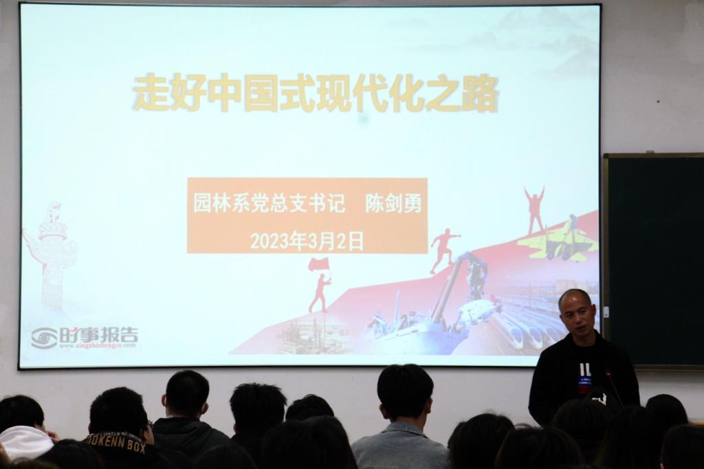 为深入学习宣传贯彻党的二十大精神,让同学们更全面地理解中国式现代化的具体内容,更准确地把握中国式现代化与西方现代化的异同,2023年3月2日晚上七点半园林系党总支书记陈剑勇以“走好中国式现代化之路”为题在教学楼208召开专题讲座,风景园林设计2101、2102全体在校学生共同参与。
