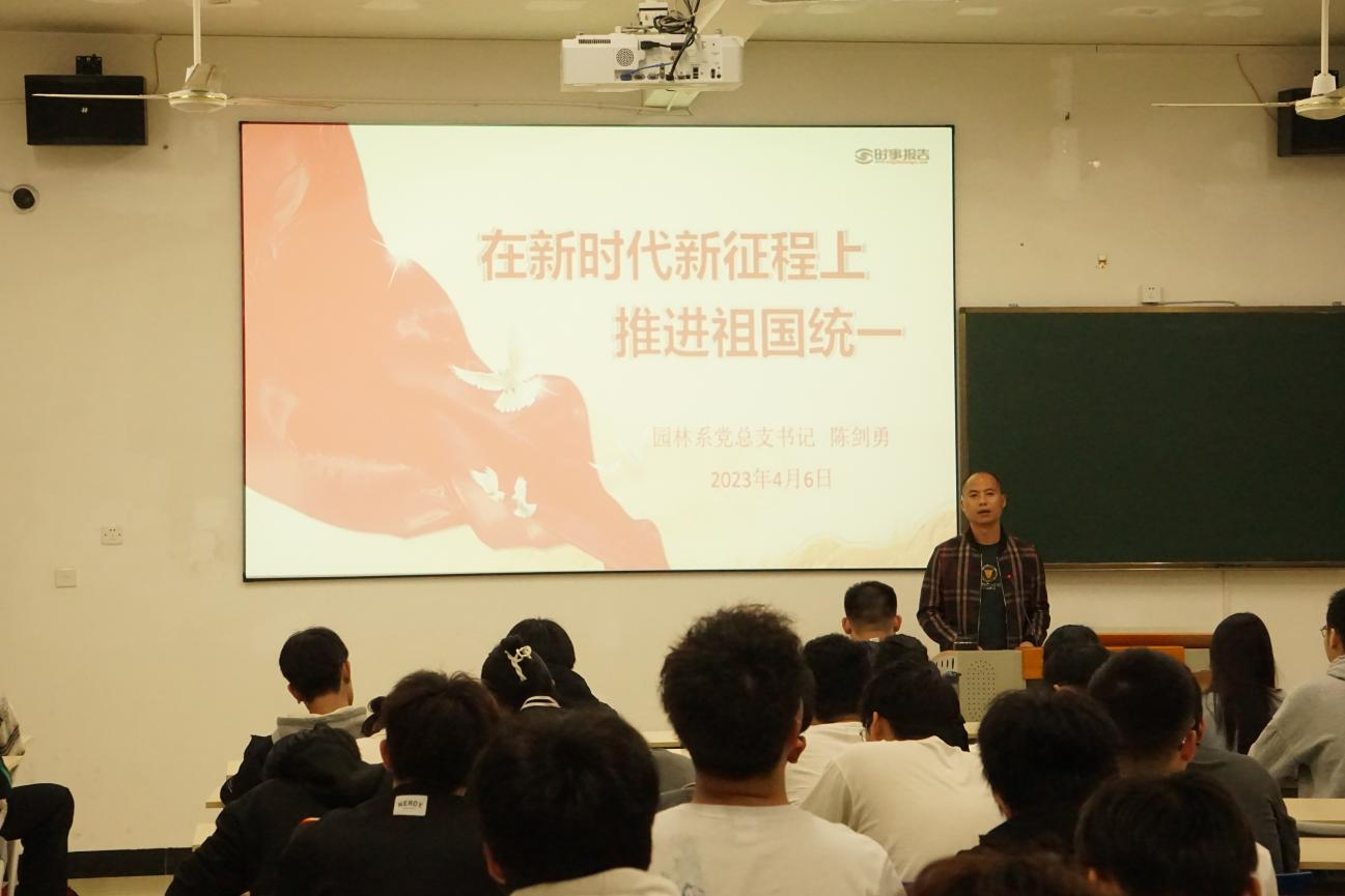 党的十八大以来,以习近平同志为核心的党中央全面推进对台工作理论和实践创新,牢牢把握两岸关系主导权和主动权,不断强化祖国完全统一的时和势。为深入贯彻落实党的二十大精神,4月6日晚七点半,园林系党总支书记陈剑勇以“在新时代新征程上推进祖国统一”为题在教学楼208召开专题讲座,风景园林设计2101、2102全体在校学生共同参与。