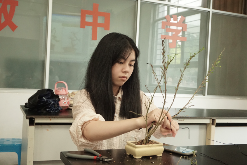 盆景美学,一盆植物,更是一种美学。在此次技能竞赛开展前,张称称老师对参赛的选手们进行了赛前培训,使其更好的了解此次竞赛的规程及要求。竞赛正式开始,选手们立即投入到紧张的制作当中。修剪、蟠扎、换盆……在短短的一小时内,看似普通的盆景素材经过选手们的巧手改造,变成了一件件精美的艺术品。