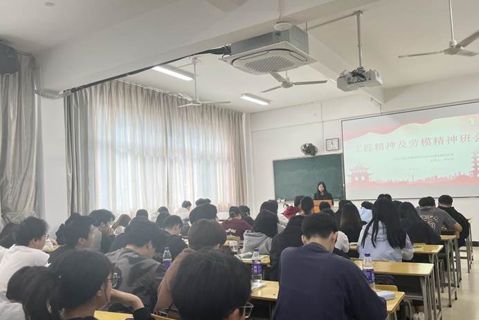 班会上,各班班长结合视频、PPT等材料,向同学们介绍工匠精神以及劳模精神的时代背景、内涵。