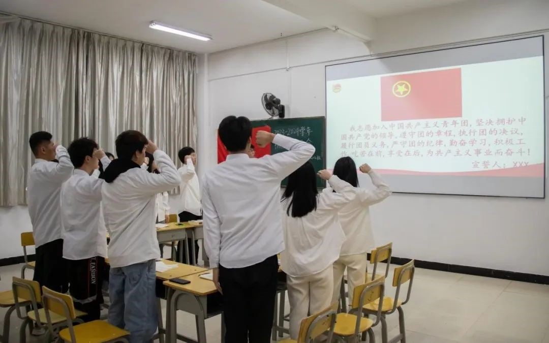班级团员在团支书的带领下重温入团誓词,“我志愿加入中国共产主义青年团,坚决拥护中国共产党的领导,遵守团的章程,执行团的决议,履行团员义务,严守团的纪律,勤奋学习,积极工作,吃苦在前,享受在后,为共产主义事业而奋斗!”