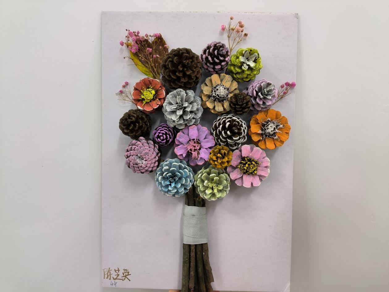 在比赛过程中,同学们利用废弃物品的特性进行改造,通过巧妙的构思和创意的发挥,将这些废弃物品变成了实用又美观的艺术品。有用松果制作的花束,也有用树枝制作的风铃,每一件作品都凝聚了参与者的智慧和创意,也传递着环保的理念和节约的精神。经过比赛的得分评定:园艺技术2302班陈芝英荣获一等奖;园林技术2203班谢绪、园林技术2203班方春绿荣获二等奖;园林技术2301班林瑾、风景园林设计2203班叶鸿、风景园林设计2202班黄佳琳荣获三等奖。