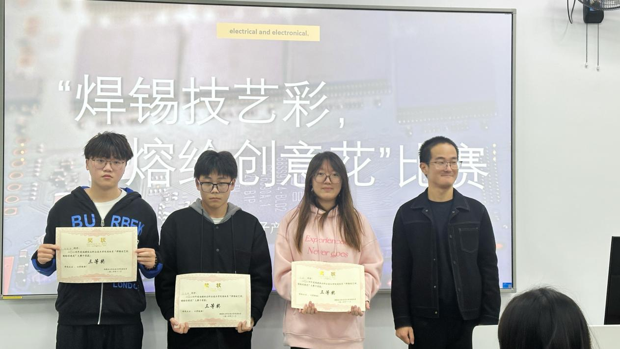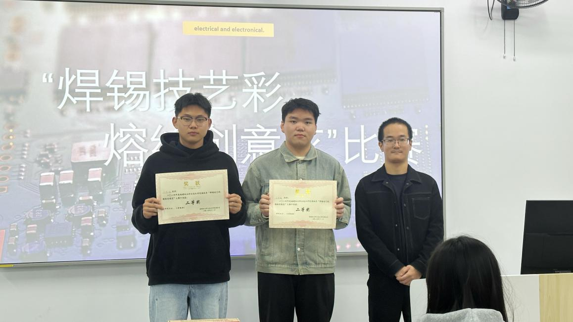 比赛伊始,严涛老师对焊接使用、操作规程、焊接技巧等方面进行了全面的讲解,帮助同学们对比赛有了更为清晰全面的认识。随即比赛便正式拉开帷幕,参赛选手们全神贯注,手持电烙铁和焊锡丝,娴熟地将零散元件焊接为精巧的电路板,感受电流与焊锡交织出的奇妙火花。每一个动作都透露出果断与坚定,每一个步骤都显得专注和熟练。经过激烈的角逐,确定了本次大赛的一等奖、二等奖、三等奖: