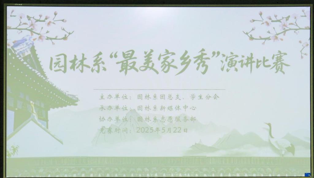 为激发大学生爱乡情怀与文化认同,促进文化交流与理解,丰富校园文化生活,2025年5月22日,园林系在园林楼603成功举行最美家乡秀演讲比赛。此次活动由园林系团总支、学生分会主办,园林系新媒体中心承办,园林系志愿服务部协办。