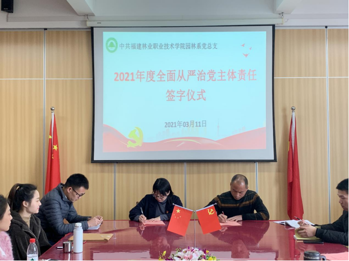 会议最后,园林系党总支举行2021年度全面从严治党主体责任签字仪式,陈剑勇书记强调要坚持以习近平新时代中国特色社会主义思想为指导,深入学习贯彻党的十九届五中全会精神,增强“四个意识”、坚定“四个自信”、做到“两个维护”,认真落实履行党风廉政建设主体责任制度,落实全面从严治党的工作安排,确保责任落实到位。系教工党支部书记黄华明、学生党支部书记吴锦鸿分别与陈剑勇书记签订《2021年度全面从严治党责任书》,黄华明与吴锦鸿书记表示他们将进一步落实全面从严治党的工作职责,恪守廉洁自律的品德风尚,强化责任担当,严格落实各项工作的主体责任。