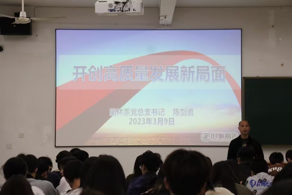 习近平总书记在党的二十大报告中指出,高质量发展是全面建设社会主义现代化国家的首要任务。为贯彻落实党的二十大精神,3月9日晚七点半,园林系党总支书记陈剑勇以“开创高质量发展新局面”为题在教学楼208召开专题讲座,风景园林设计2101、2102全体在校学生共同参与。