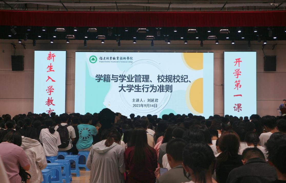 为落实立德树人根本任务,引导广大学生坚定理想信念,尽早完成角色转变,尽快适应大学生活,2023年9月14日晚上19点,园林系于江南校区体育馆举行2023级新生入学教育。本场新生入学教育内容为:学院章程、学籍与学业管理、校纪校规、大学生行为准则的介绍以及学生资助体系政策解读,分别由刘延君老师、曹婧老师负责讲解,园林系2023级全体新生参加。