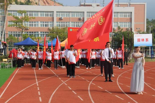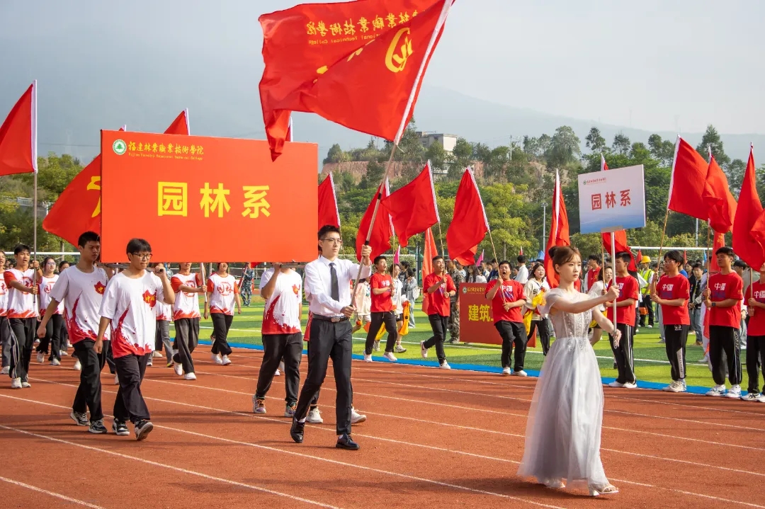 迎着日出光照的洗礼,阵阵歌声悦耳激昂,方队到场就位,各系用舞蹈、戏剧变脸、情景剧等艺术形式为建校七十周年及开幕式祝贺,铿锵有力的祝词充满着整个田径场。园林系同学们手握红黄扇,在空中摇摆,举起红旗在跑道上奔跑,用最好的状态诠释了对青春的向往,在表演的最后园林系方阵摆出“70”字样一同为学院庆生。园林系方队在参赛队伍中脱颖而出,荣获本次入场方阵第一名,取得三连冠的好成绩。