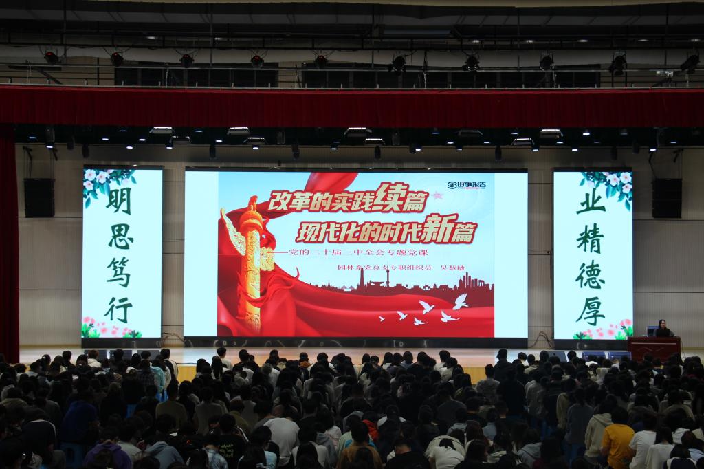 为深入学习贯彻党的二十届三中全会精神,深入开展新生入学教育系列活动,引导大学生坚定理想信念。2024年10月8日,园林系于江南体育馆开展以“改革的实践续篇,现代化的时代新篇”为主题的形势与政策党课,此次党课由园林系专职组织员吴慧敏主讲,园林系新生辅导员及2024级全体新生到场参加。