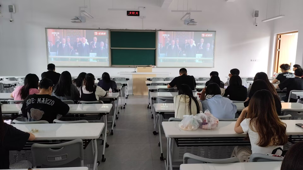 上午9时,阅兵仪式准时启幕。雄壮的中华人民共和国国歌《义勇军进行曲》响彻天安门广场,五星红旗冉冉升起。期间,全体师生目光紧随屏幕中飘扬的国旗,赤诚的爱国情感在静静流淌、汇聚。直播画面里,承载着厚重历史记忆的抗战老部队方队步履铿锵,彰显新时代国防实力的徒步方队、装备方队与空中梯队依次亮相——整齐划一的阵型展现钢铁意志,精良先进的装备彰显大国底气,气势昂扬的姿态传递奋进力量,每一幕都深深震撼着师生的心,师生们专注凝视屏幕,或用镜头定格,大家都深刻体会到今日国家繁荣强盛的来之不易,以及国防力量蓬勃发展的磅礴气势。