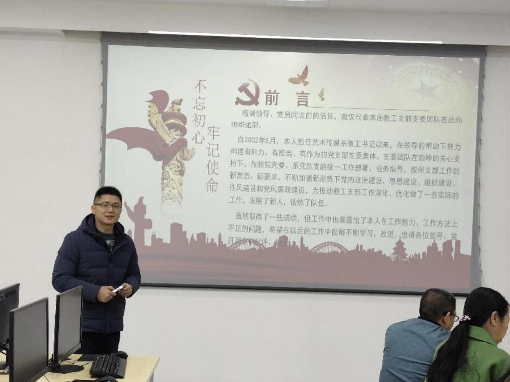 为充分发挥党建政治引领作用,夯实基层党建工作,2023年2月14日上午,艺术传媒系党总支在江南校区艺术楼201教室召开2022年度党支部书记抓基层党建工作述职评议考核会议。系党政领导班子成员、各党支部书记、支委、教师代表参加会议。建筑工程系党总支专职组织员叶新颖受党委组织部(统战部)委派,莅临现场观摩指导。本次会议由系党总支书记陈政主持。
