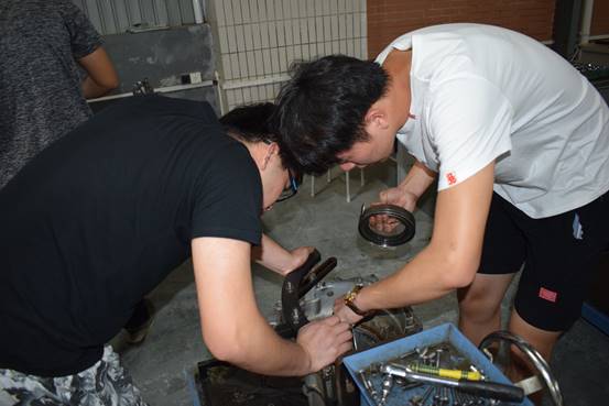 训练过程中,同学们认真地对汽车变速箱进行拆除和组装,指导老师对选手们的日益长进表示了认可。