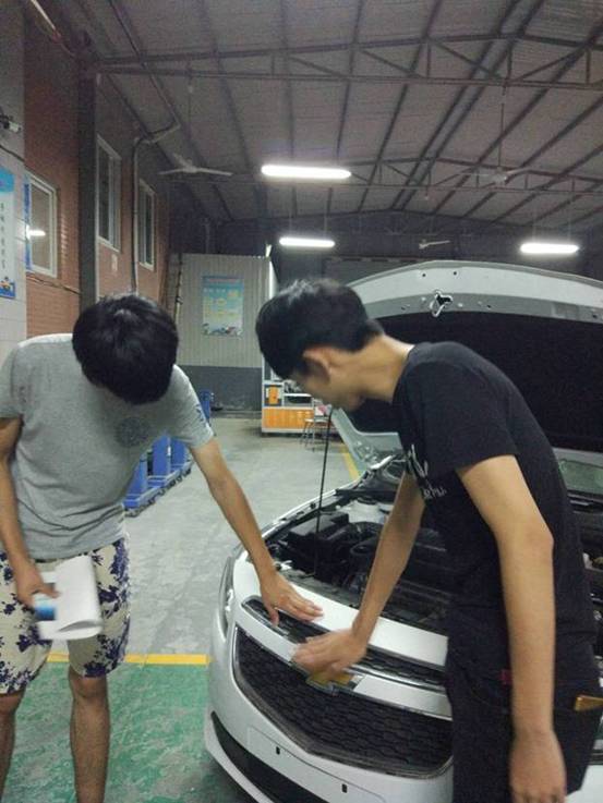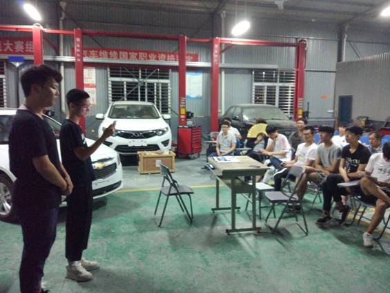从报名到现在,已有24位同学,共8个小组参赛。根据指导教师制定的训练计划,学生利用课余时间,在实训三汽车车间展开训练。下面是学生训练的场景。