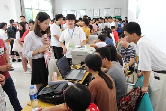 6日在实训四的门前众多的迎新学长学姐马上微笑着迎上去:“你好”,“欢迎来到学校”,并“抢”下新生和家长手中沉重的行李。 迎新工作如火如荼,学长学姐们不厌其烦地给新生、家长解答他们提出的各种问题。