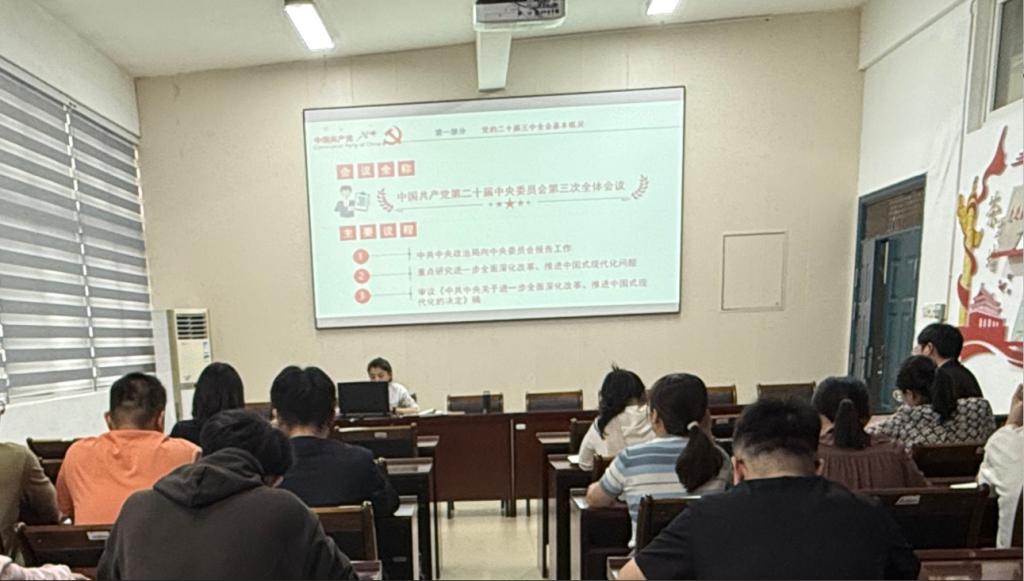 会上,余慧婷老师解读了党的二十届三中全会精神的要点内容,强调了学习全会精神的重要性和紧迫性。她指出,党的二十届三中全会是在我国进入全面建设社会主义现代化国家新征程、向第二个百年奋斗目标进军的关键时刻召开的一次十分重要的会议,会议提出了一系列具有深远意义的决策和部署,对于推动党和国家事业发展具有重大而深远的意义。