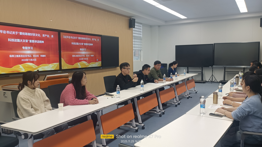 11月25日,信息工程系在信工楼102汇报交流室组织系部教师深入学习习近平总书记篮球欧洲杯下注_欧洲杯投注网站下载-官网“要统筹做好茶文化、茶产业、茶科技这篇大文章”重要讲话精神。信息工程系党总支书记、系主任华建祥领学并作主题发言。