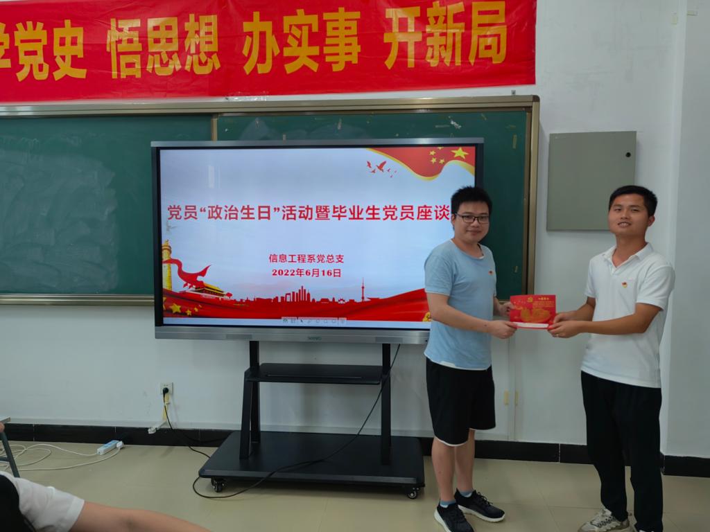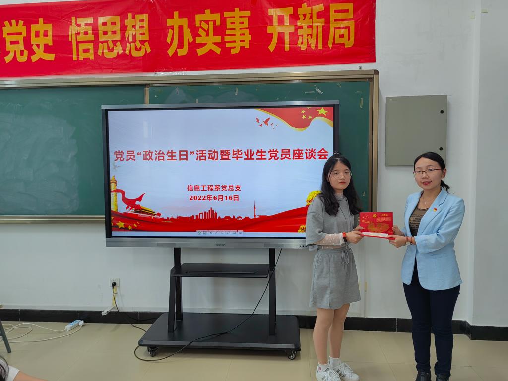 自被党支部通过成为预备党员的那一天起,每名党员便开始拥有了自己的“政治生日”,过“政治生日”是党员对政治身份的认同,更是对初心使命的重温。为进一步强化党员的身份意识和责任意识,信息工程系党总支于2022年6月16日下午在实训三408会议室开展“党员政治生日”活动暨毕业生党员座谈会。信息工程系党总支书记罗志斌、党总支副书记叶文美、组织员谢婉欣、学生党支部书记郑燕丽、陈邦凯、刘克芹,及48期学生党员参加了活动。