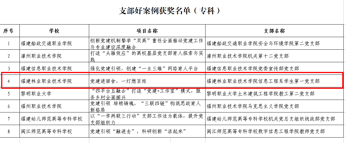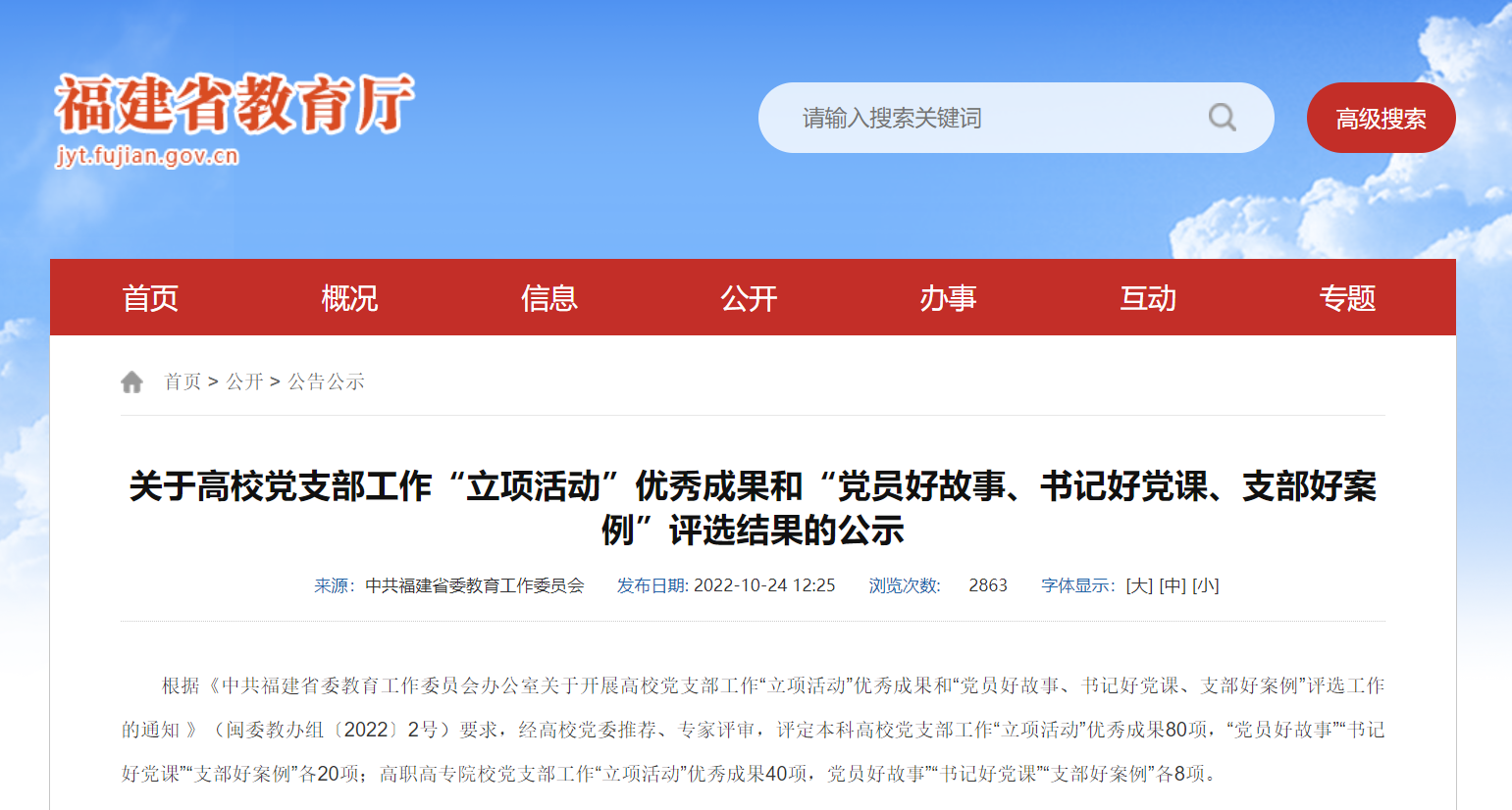 近日,中共福建省委教育工作委员会公示了“书记好党课、支部好案例”评选结果,其中高职高专院校“书记好党课”“支部好案例”各8项,我系学生第三党支部书记刘克芹老师党课《争做堪当民族复兴重任的时代新人》、学生第一党支部好案例《党建进宿舍,一灯燃百炬》分别获奖。这是继我系2020年教工支部申报的支部立项获得福建省高职高专院校党支部工作“立项活动”优秀成果一等奖、2021年系党总支被授予“福建省高校先进基层党组织”荣誉称号、2022年系党建工作品牌项目“多措并举推进党建工作提质增效”入选福建省新时代党建优秀案例、2022年系党总支正式成为“第二批全国党建工作标杆院系”后,我系在创先争优工作中取得的又一成果。