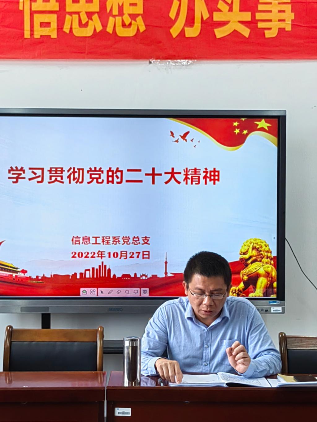 作为全国党建工作标杆院系,信息工程系全体党员干部要“学好党的二十大、讲好党的二十大、用好党的二十大”,迅速掀起学习宣传贯彻党的二十大精神热潮,迅速掀起学习宣传贯彻习近平新时代中国特色社会主义思想的高潮,牢记为党育人、为国育才的使命,引导广大师生学懂弄通报告的核心要义、精神实质、丰富内涵和实践要求,努力培养堪当重任的时代新人。