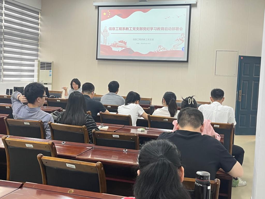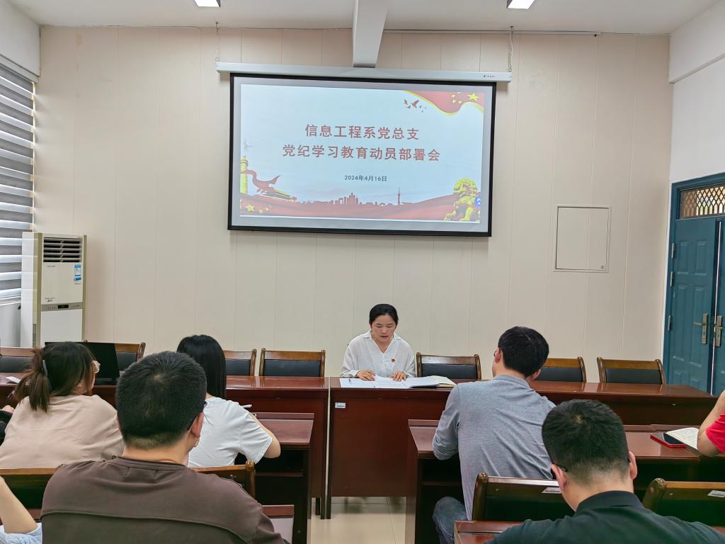 4月16日下午,信息工程系党总支召开党纪学习教育动员部署会,传达学习习近平总书记篮球欧洲杯下注_欧洲杯投注网站下载-官网党纪学习教育的重要讲话和重要指示精神,学习贯彻落实中央党的建设工作领导小组会议和《中共中央办公厅篮球欧洲杯下注_欧洲杯投注网站下载-官网在全党开展党纪学习教育的通知》精神以及省委常委会会议暨党的建设工作领导小组会议精神和院党委扩大会议暨党的建设和全面从严治党工作领导小组会议精神,专题部署开展党纪学习教育。系党总支副书记(主持工作)叶文美主持会议,系部全体师生党员参加会议。