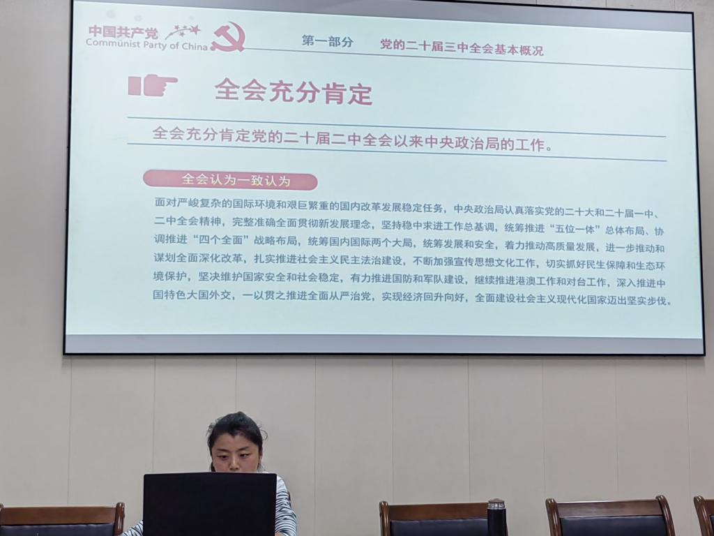 会上,余慧婷老师解读了党的二十届三中全会精神的要点内容,强调了学习全会精神的重要性和紧迫性。她指出,党的二十届三中全会是在我国进入全面建设社会主义现代化国家新征程、向第二个百年奋斗目标进军的关键时刻召开的一次十分重要的会议,会议提出了一系列具有深远意义的决策和部署,对于推动党和国家事业发展具有重大而深远的意义。
