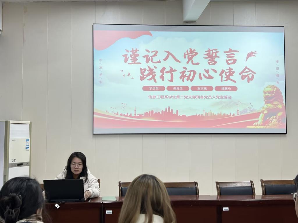 为持续深入开展学习贯彻习近平新时代中国特色社会主义思想主题教育,秉承信仰之光,践行初心使命,切实提升新党员的责任感与使命感,2025年1月2日,信息工程系学生第二党支部在信工楼408会议室及党建馆举行预备党员入党宣誓仪式。信息工程系学生第二党支部教师党员与56期预备党员参加仪式。