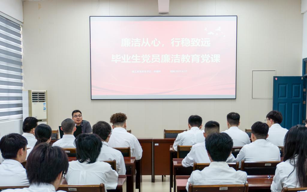 系党总支书记华建祥老师以《廉洁从心,行稳致远——毕业生党员廉洁教育党课》为主题,结合中央八项规定精神与青年党员职场成长典型案例进行深度解读,生动阐释“廉洁自律是党员终身必修课”的深刻内涵。他特别强调,毕业生党员步入社会后需警惕物质诱惑、人情干扰等廉洁风险,以底线思维筑牢思想防线,让清廉作风成为扣紧职业生涯“第一粒扣子”的精神坐标。华书记饱含深情寄语全体党员:愿大家在新征程中始终以党员身份为荣,在困难挑战前勇毅前行,以躬身实践诠释使命担当,让廉洁之光照亮未来征途的每一步。