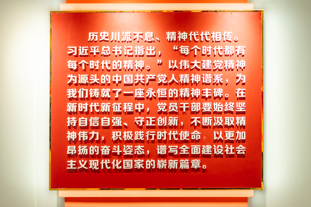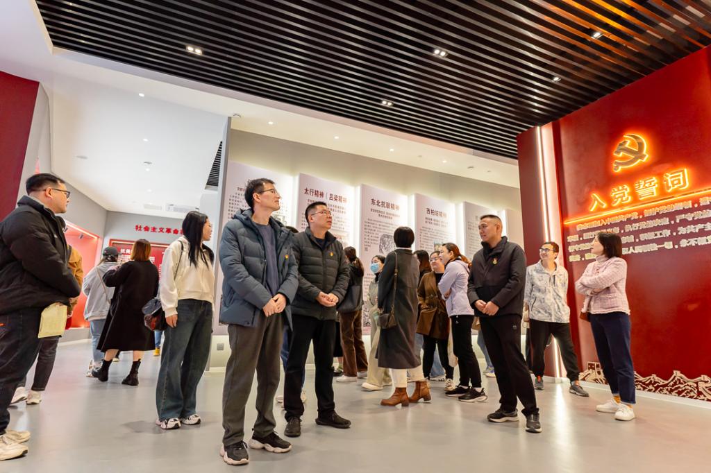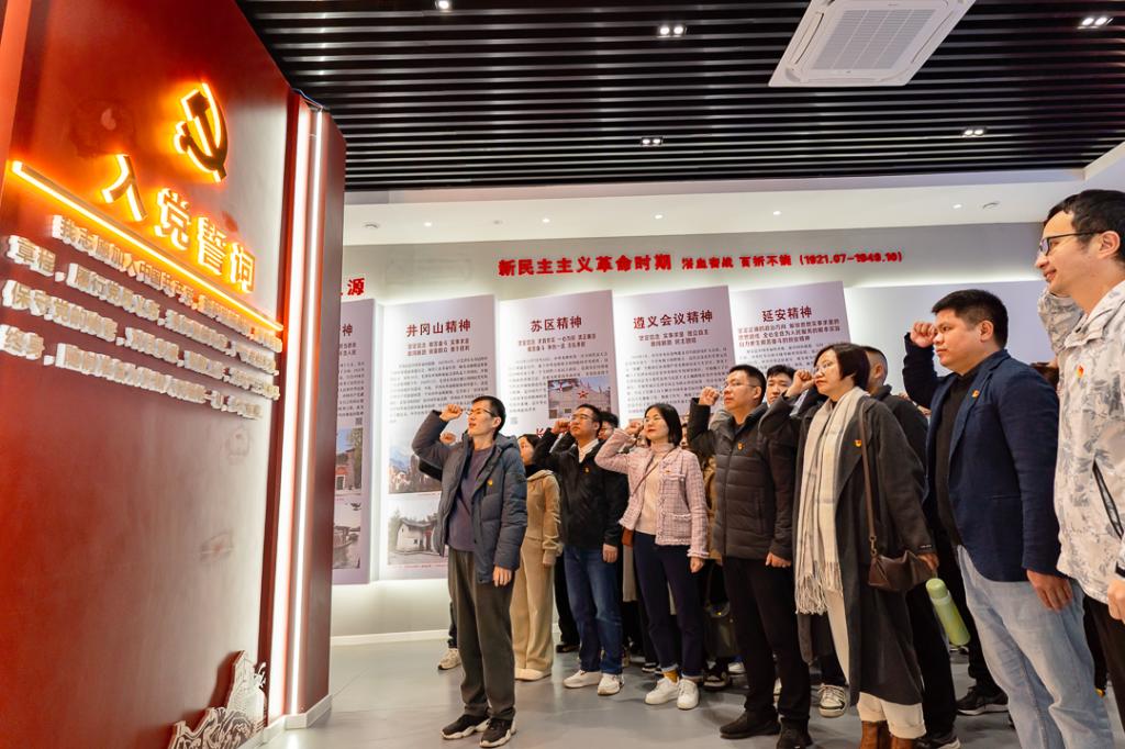 在中国共产党人精神谱系主题馆内,学生工作部部长陈友益带领全体党员面对鲜红的党旗,庄严肃立,重温入党誓词,回忆入党初心。铿锵有力的誓言展示了辅导员们一心向党的崇高理想信念。展馆内通过多维度、多层次、多融合的方式展现了中国共产党在不同历史时期铸就的一系列伟大精神的丰富内涵和精神实质,构造起璀璨夺目的中国共产党人精神谱系。