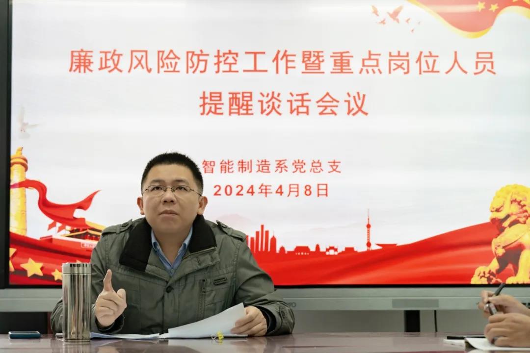 为进一步深入推进全面从严治党和党风廉政建设工作,增强干部职工廉政风险防控意识,筑牢拒腐防变思想防线,4月8日下午,智能制造系党总支在系部会议室召开廉政风险防控工作暨重点岗位人员提醒谈话会议。系部党政领导班子成员和系部全体行政坐班人员参加会议,会议由系总支书记罗志斌主持。